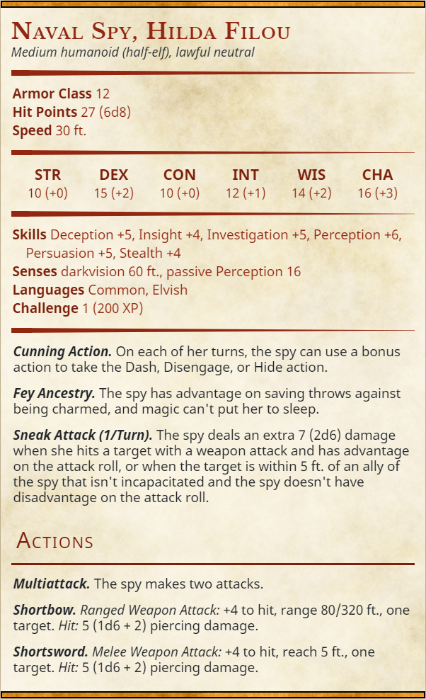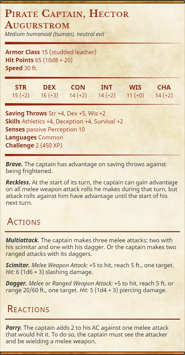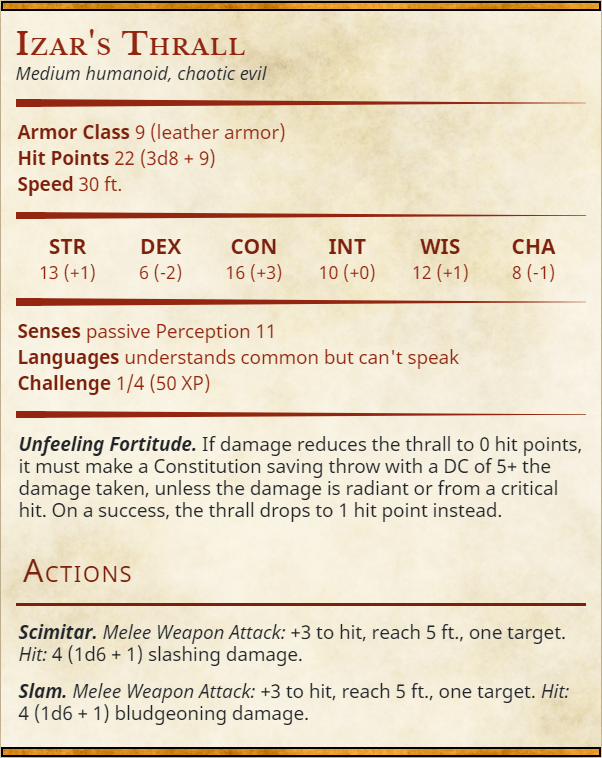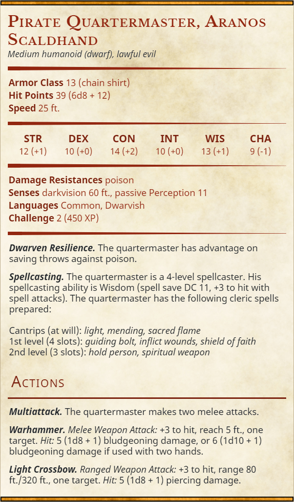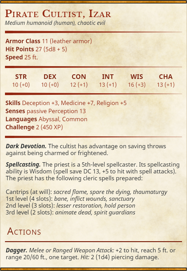 A combination of the bandit and cult fanatic statblocks, modified with dwarven abilities and a fitting spell list. He will protect his Captain but does not feel the same for Izar.