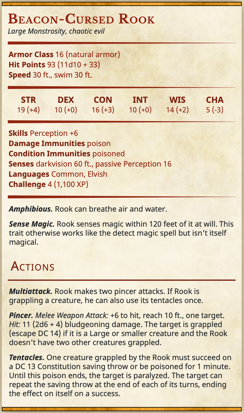 The Beacon’s influence on Rook has merged the druid’s body with sea creatures. Patches of his skin have turned chitinous, his hands have transformed into pincers, and tentacles emerge from beneath his ribs.