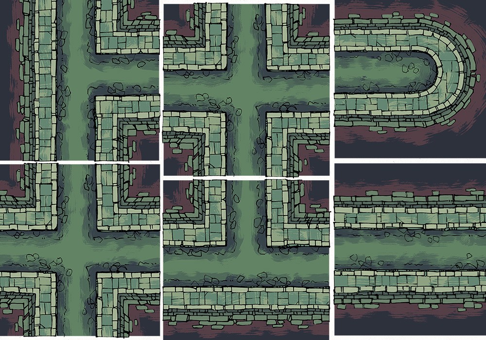 An network of dripping tunnels lined with grime, debris, and unspeakable things. And with these four map tiles, they can go on just as far as you need!