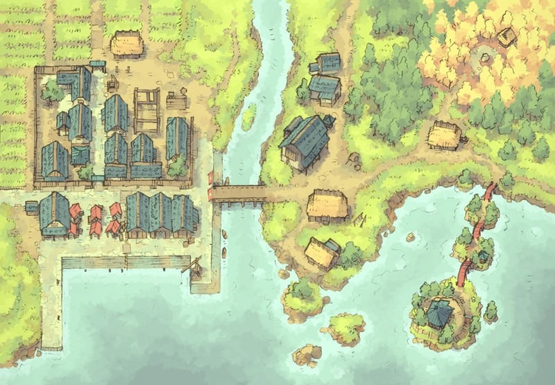 One of your first questions when planning a small town should be asking what its purpose is in terms of your world. For a settlement to fit, its design should reflect its environment. Think about the resources that the location gives people and how a town might have grown from that. How does the town sustain itself? A settlement in open plains might favor farming crops and livestock, while a forested area could hunt for food and trade lumber to neighbors. Coastal towns have access to both fishing and trade via docks. Consider the nearby landscape and how that influences construction, as these industries are likely how the town began.