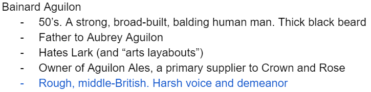 Planning notes for these kinds of characters should be as simple and streamlined as you can make it. My method involves keeping text documents with lists of characters, separate from each session’s notes. I divide them into each character’s faction, association, or primary hangout. I assign them a name first, as well as a concise description of who they are to prevent confusion between characters. Under that is a brief summary of their visual appearance. I include age, hair, and basic facial structure, before describing their clothing or unique features. Their voice and demeanor are then noted in several keywords and a different font color, for speed of access. Under that, and again in a new color, I record brief notes of the interactions with them and how the character will then act between that moment and the next time the party meets them.